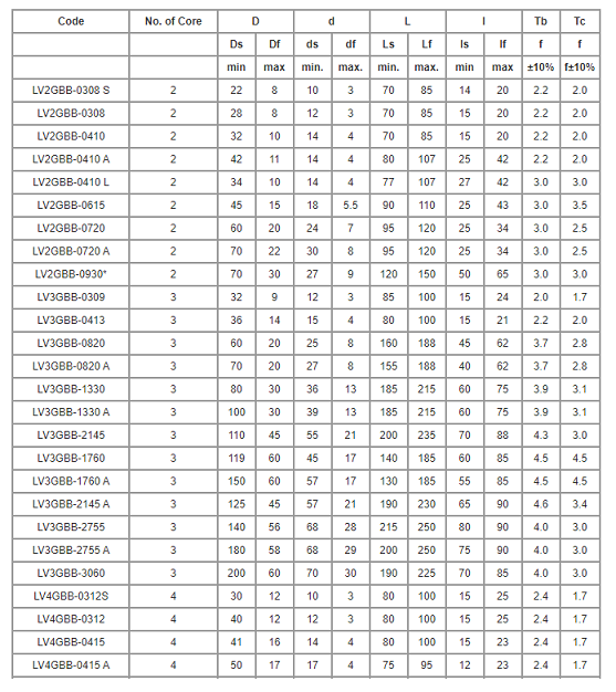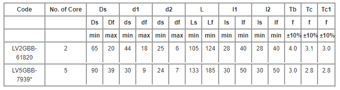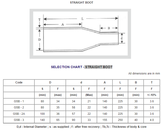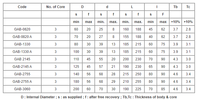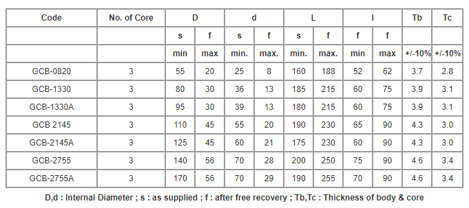 D,d : Internal Diameter ; s : as supplied ; f : after free recovery ; Tb,Tc : Thickness of body & core ** New Designs